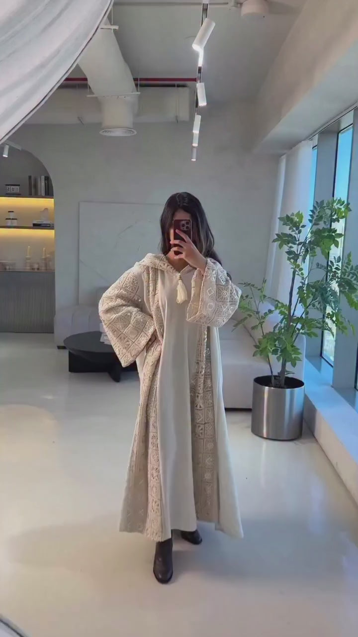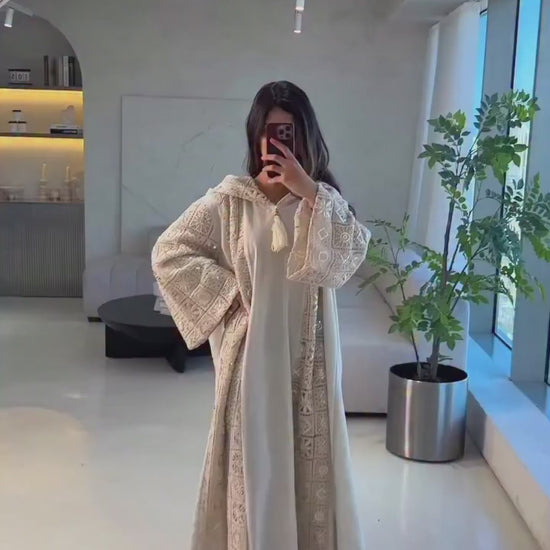 البرنوس مبطن وبشغل يدوي متقن، مكمل جمال الموديل ولمسة مختلفة في التصميم.