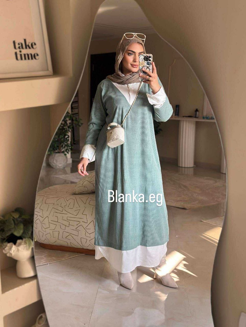 فستان قطعة واحدة بتصميم أنيق ومميز، مزين بأطراف قميص من خامة كتان تركي بتفاصيل راقية تضيف لمسة عصرية فخمة.