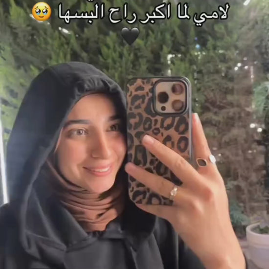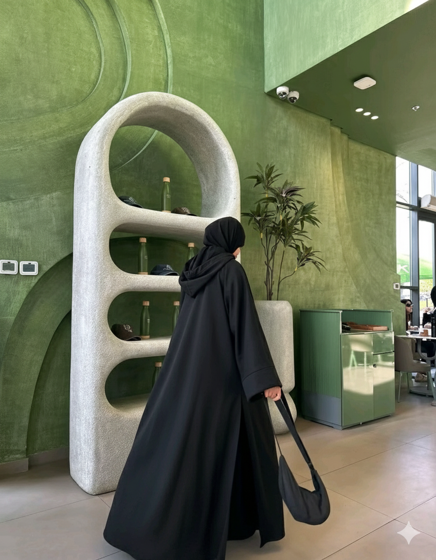 عباءة شمواه سويدي بغطاء رأس، تصميم واسع بفتحتين جانبيتين لراحة وحركة أسهل، خامة ناعمة أنيقة مناسبة للوك يومي عصري.