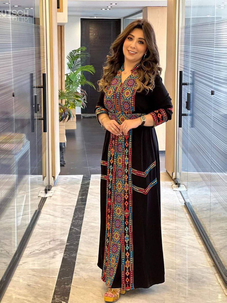 التطريز: شغل إيتامين يدوي بألوان متناغمة تعكس التراث بأسلوب عصري جذاب على الصدر والأكمام.