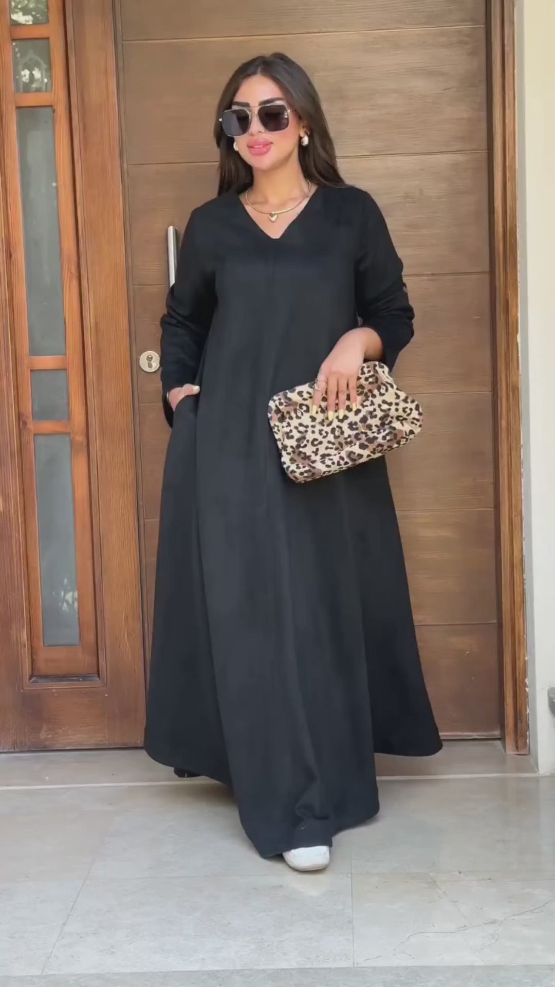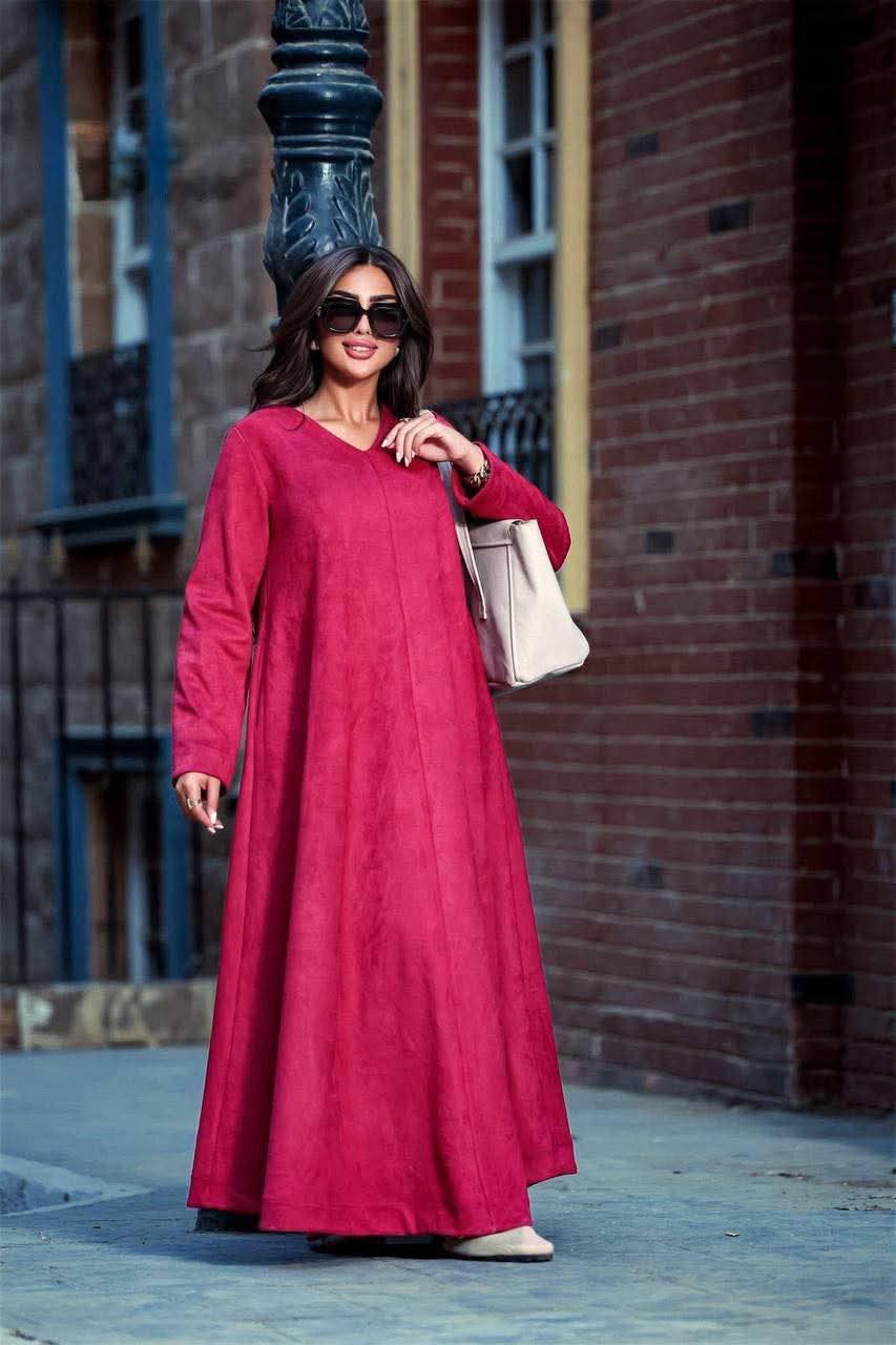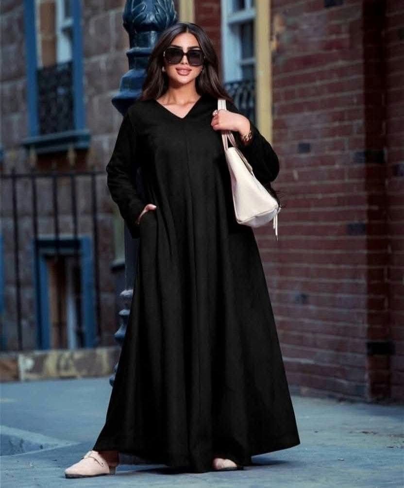 رقبة سبعة بتدي شكل أنثوي بسيط، مع قصّة دبل كلوش تمنح وسع وانسيابية، وشيمة أمامية بالطول تضيف لمسة شيك.