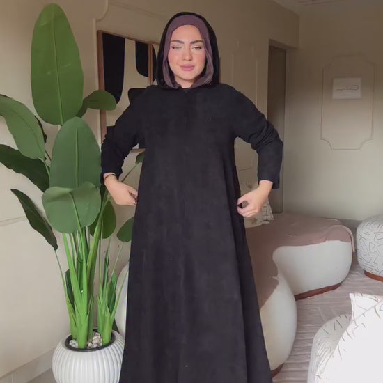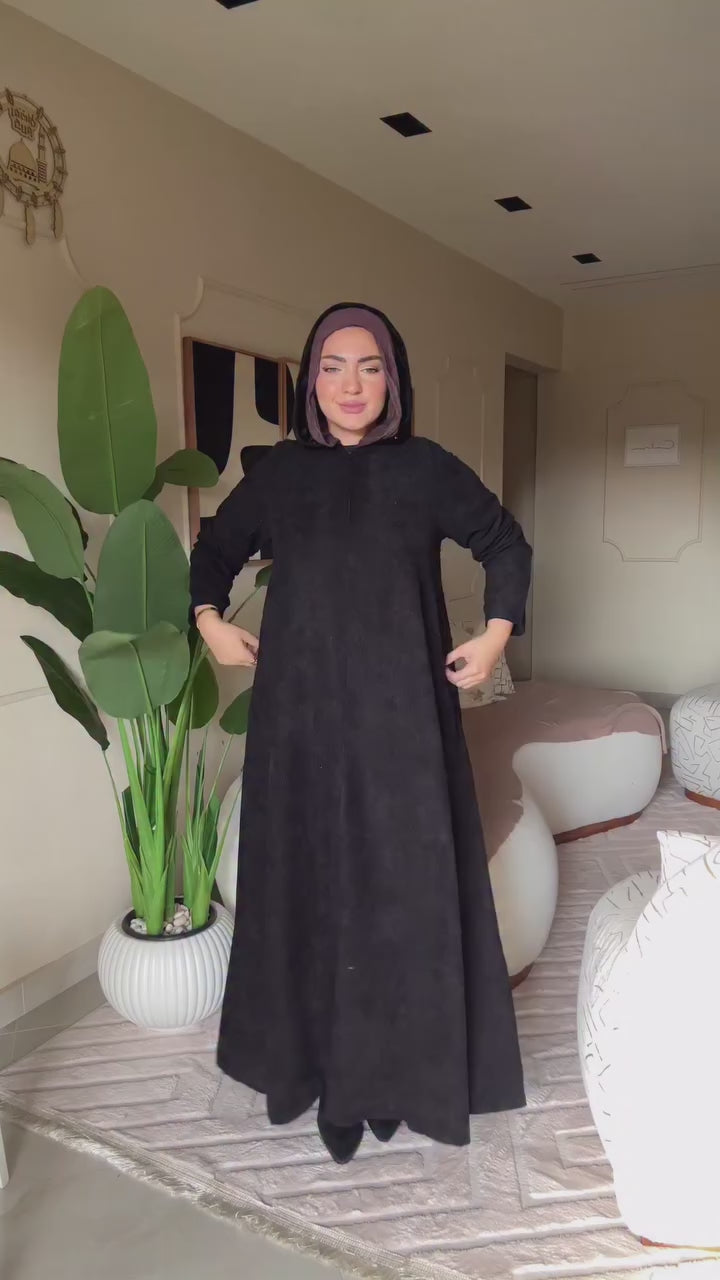 فستان هودي شتوي ضبل كلوش خامة قطيفه مسطر