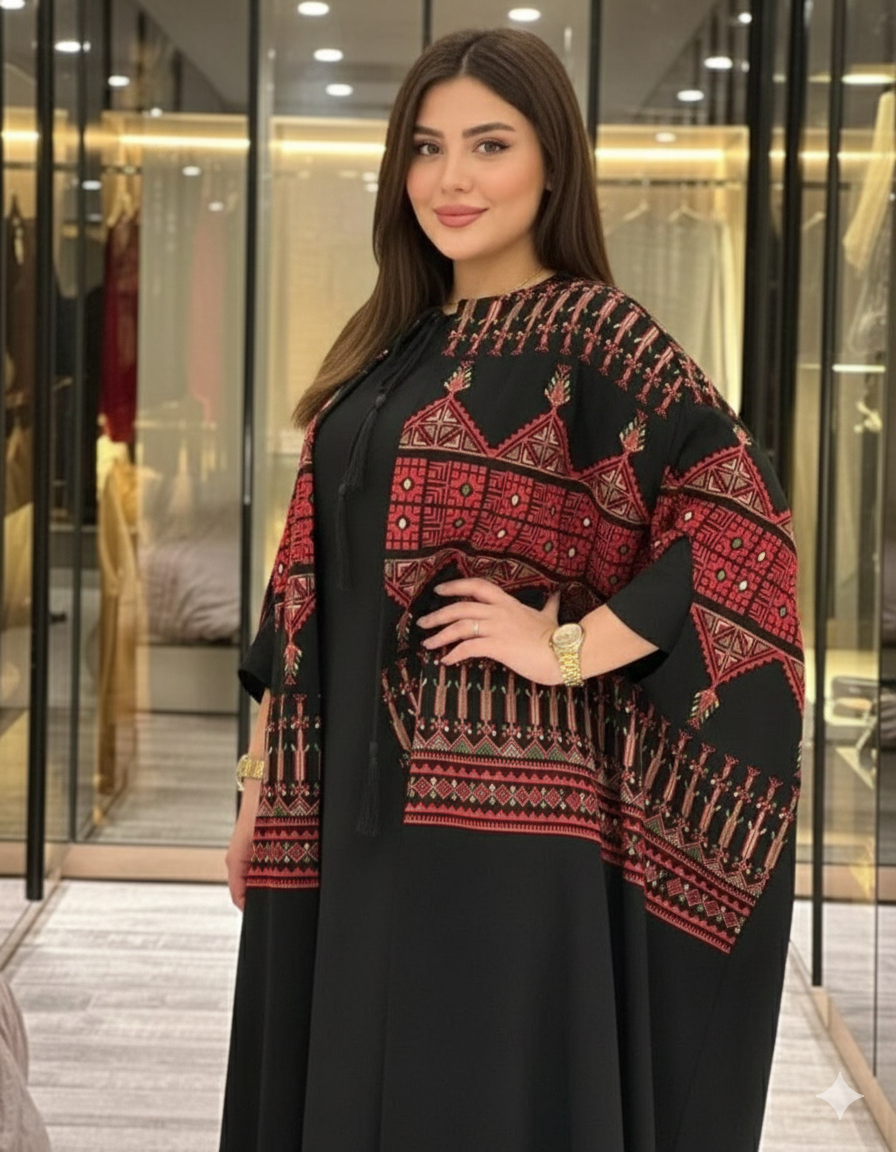 التصميم: قفطان عصري مزين بتطريزات ملونة مستوحاة من التراث، بفتحة صدر أنيقة وشراشيب ذهبية.