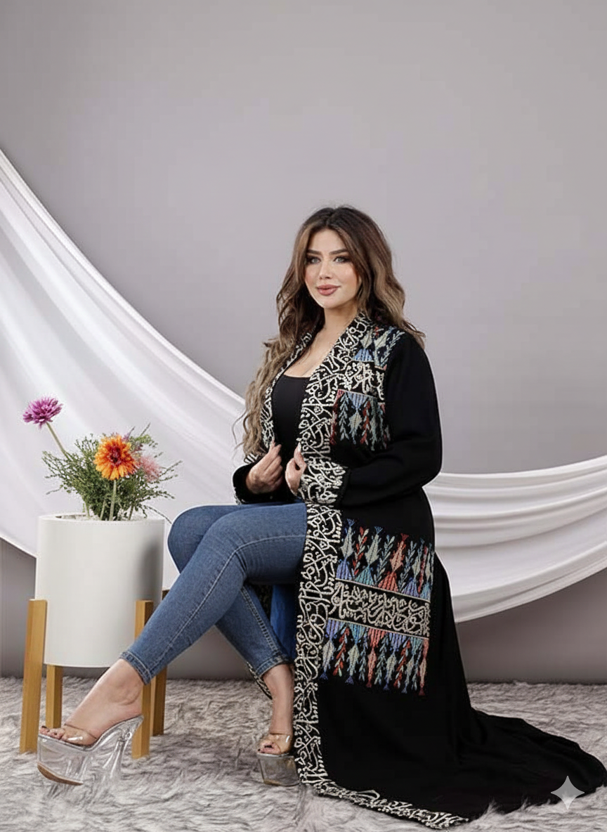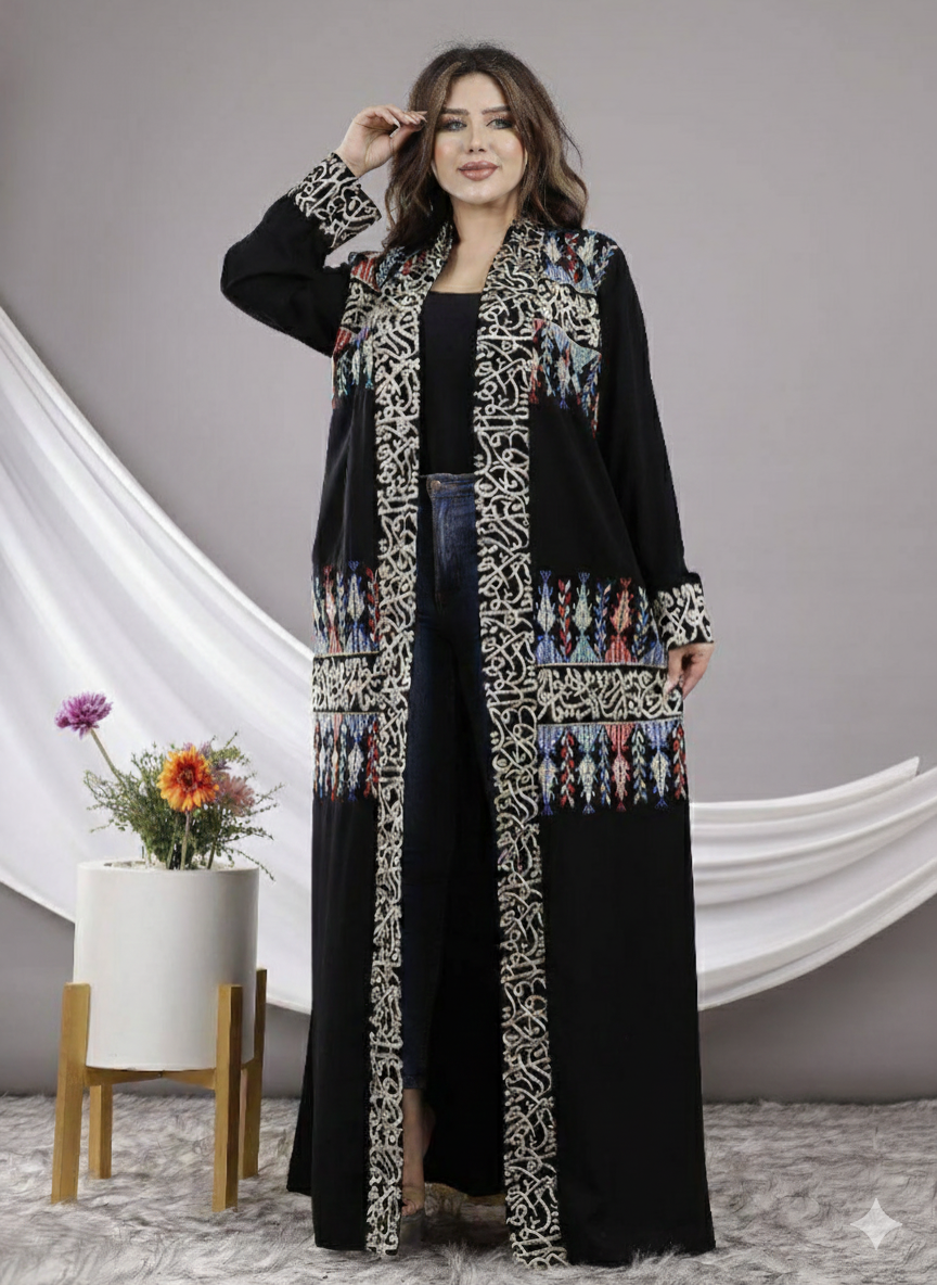 قطعة فاخرة مصنوعة من خامة الكريب السعودي عالية الجودة، التي تضمن انسيابية وخفة في الحركة. يتميز الموديل بتطريز مستوحى من التراث الفلسطيني الغني، يغطي الأطراف بألوان مشرقة على خلفية سوداء أنيقة. تصميم مفتوح وعصري يضيف لمسة مميزة وفنية لإطلالتك اليومية أو مناسباتك الخاصة.