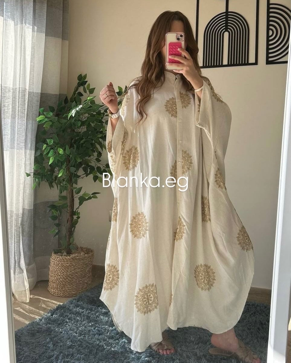 تصميم راقي بخامة كتان إيطالي مريحة، مطرزة تطريز يدوي وش وظهر بتفاصيل فخمة.